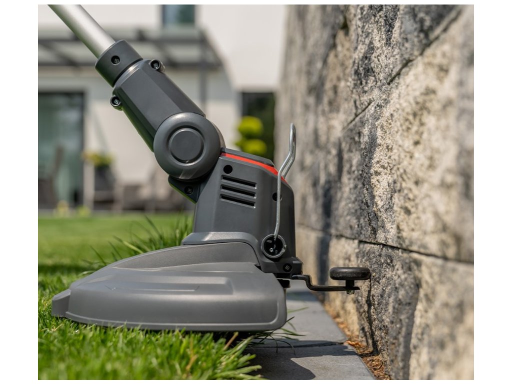S hmotnosťou len 2,4 kg vrátane batérie a ergonomicky nastaviteľnou prídavnou rukoväťou je tento vyžínač vysoko mobilným a ľahko použiteľným pomocníkom pre každého majiteľa záhrady. Flexibilná, otočná strunová hlava so šírkou záberu 25 cm a ochranou rastlín zabezpečuje presné zastrihávanie na okraji trávnika, pod kríkmi a na stenách. Vďaka automatickému mechanizmu môžete počas zastrihávania ľahko nastaviť optimálnu dĺžku struny poklepaním strunovej hlavy o zem. Výškovo nastaviteľnú hliníkovú teleskopickú hriadeľ si môžete individuálne nastaviť podľa svojej výšky. Sklopné koliesko na orezávanie okrajov vám pomôže čisto orezávať okraje.