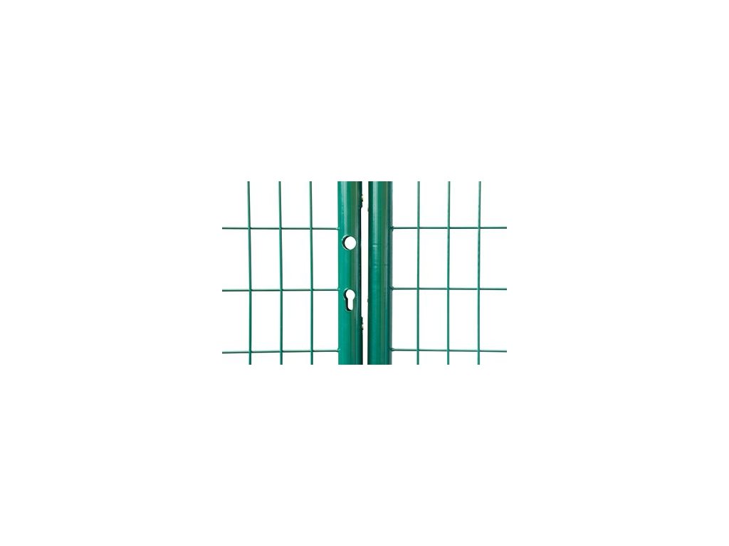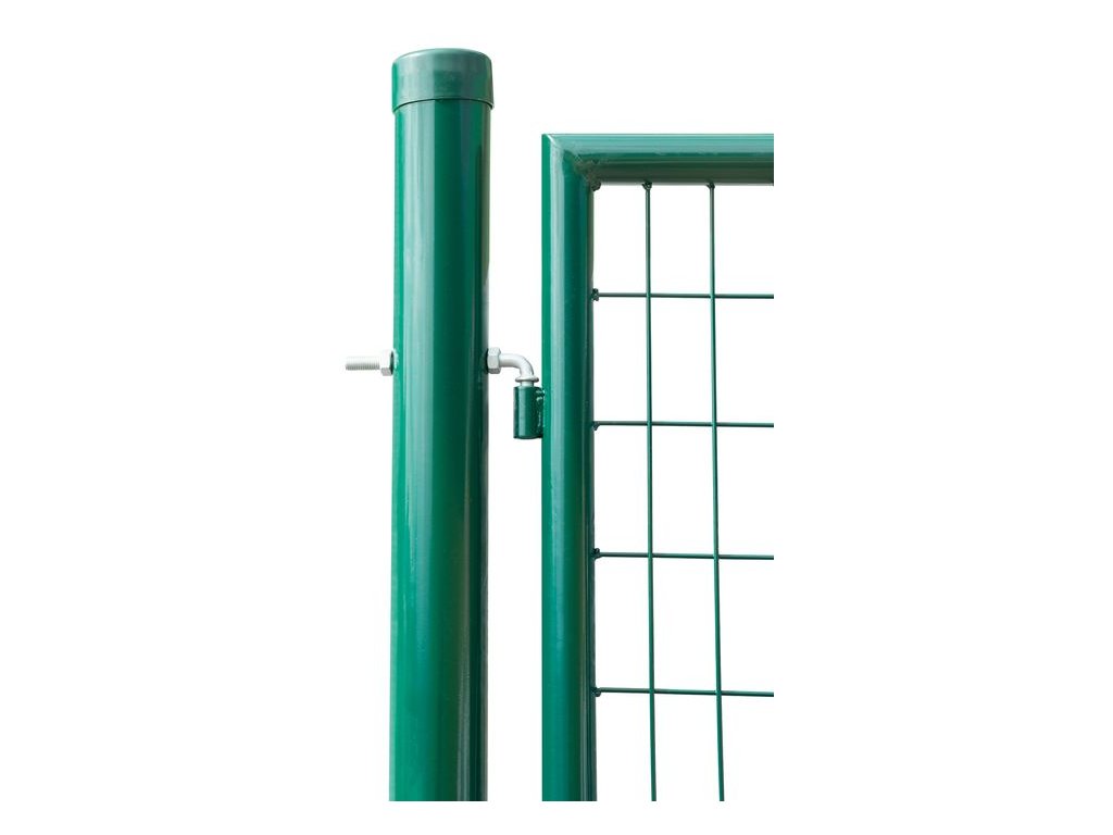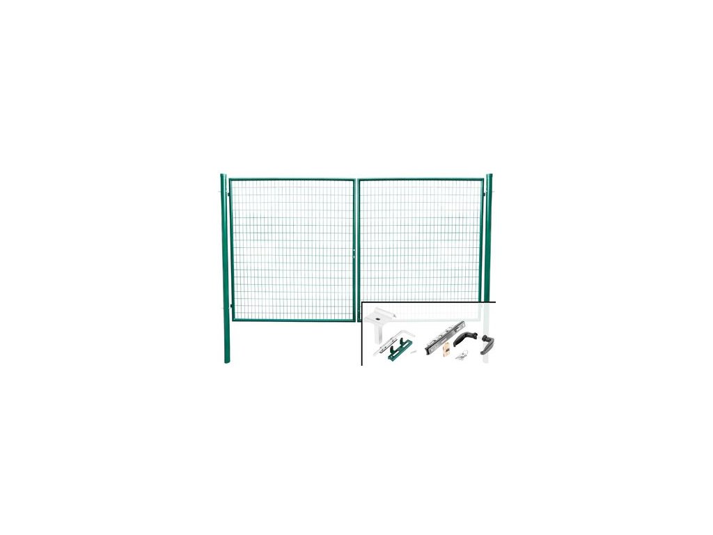 Záhradná dvojkrídlová brána s výplňou zváranej siete s okami vo veľkosti 50 x 100 mm a hrúbkou drôtu 3,5 mm. Priemer stĺpika je 76 mm. Úprava je zinok + PVC. Farba zelená.