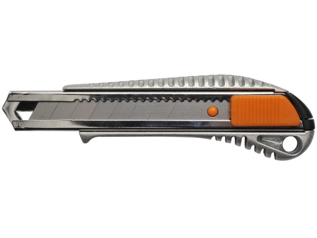Kvalitný, odolný celokovový odlamovací nôž s ergonomickým telom pre pohodlný a pevný úchop. Tento profesionálny odlamovací nôž ma masívne telo zo zliatiny zinku a nerezovej ocele. Na zadnej strane noža je pogumovaná časť, ktorá slúži proti posunutiu noža v ruke. Nechýba automatické uzamknutie čepele a praktické očko na zavesenie. Odolné kovové vedenie britu. Čepeľ noža má šírku 18 milimetrov.