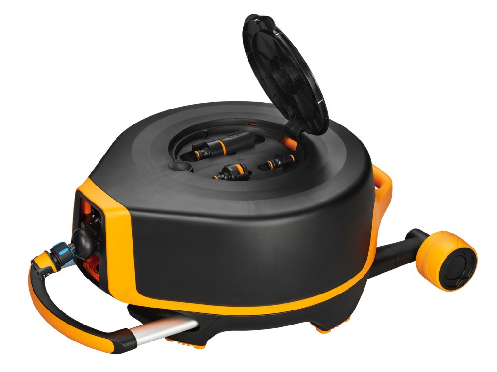 Automatický bubon FISKARS XL s kolieskami predstavuje integrovanú, praktickú schránku s príslušenstvom, ktorá je pripravená k okamžitému používaniu na zavlažovanie vašej trávnatej plochy alebo záhrady. Bubon je vybavený multi spojkou na kohútik, spojkou na hadice a zavlažovacou koncovkou Comfort. Priemer hadice je 13 milimetrov (1/2"), v dĺžkach 7 metrov (prívodná hadica) + 20 metrov (výstupná hadica). Môžete ho kamkoľvek ľubovoľne umiestniť. Vďaka jeho 360° rotácii dokáže zavlažiť fascinujúco veľkú plochu trávnatého porastu. To predstavuje až 1250 m² plochy. Hadica sa automaticky navíja, takže nebudete mať žiadne problémy pri jej zmotávaní. S horizontálnym prevedením bubna sa nemusíte báť, že by sa prevrátil, či už pri navíjaní alebo odvíjaní hadice. V bubne je zabudovaný aj teleskopický držiak, pre čo najjednoduchšie prenášanie a manipuláciu. Taktiež ho môžete pripevniť na stenu. (držiak k upevneniu na stenu sa dodáva samostatne). Kolieska výrazne uľahčujú premiestňovanie bubna.