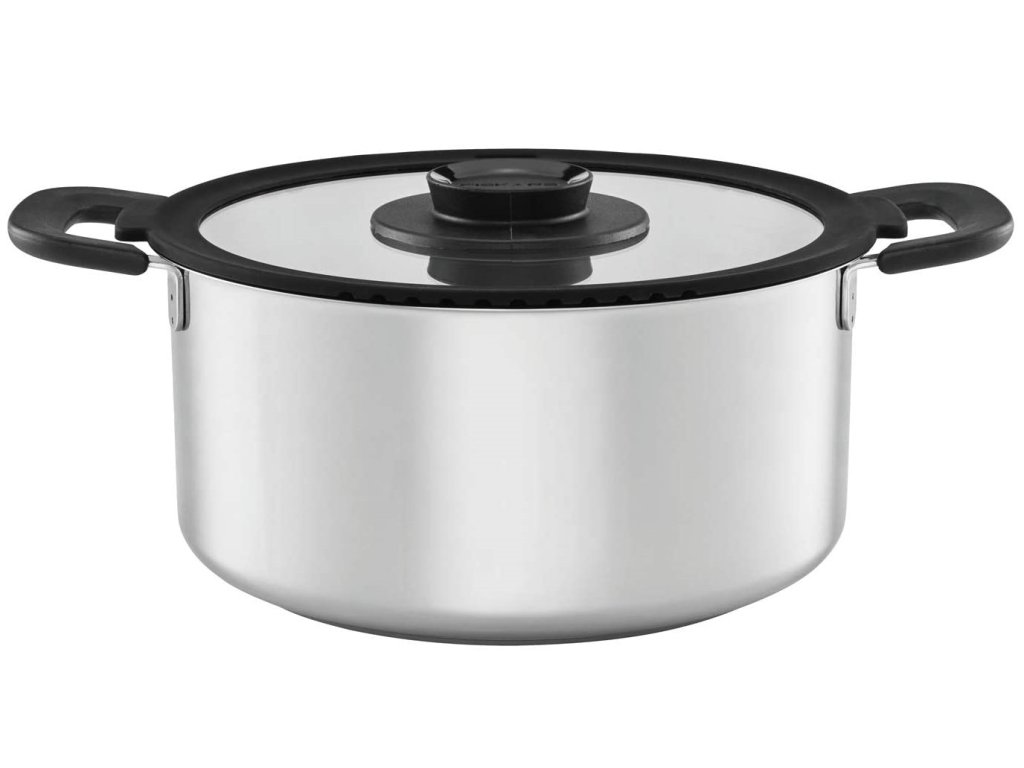 Kvalitný 5 litrový hrniec s pokrievkou FISKARS z rady Functional Form ideálny pre každodenné jednoduché varenie na všetkých typoch varných dosiek. Hrniec je vyrobený z nerezovej ocele 18/10. Má široké bakelitové držadlá, ktoré zostávajú počas varenia vždy chladné a poskytujú bezpečný a pohodlný úchop. Plochá pokrievka je vybavená dvoma otvormi pre zlievanie vody, odvod pary a silikónovým okrajom pre tiché manipulovanie. Hrniec vďaka svoju dizajnu zaberie v úložnom priestore minimum miesta. Jednoducho sa čistí a veľmi dobre odoláva poškodeniu v dôsledku umývania v umývačke riadu. Bezpečné používanie v trúbe až do 150°C.