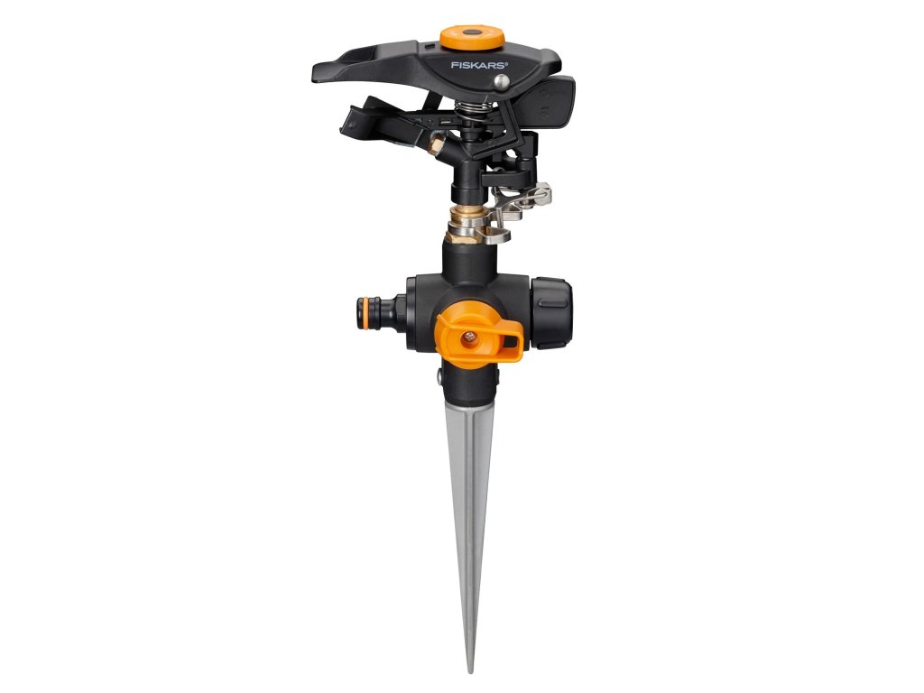 Impulzný zavlažovač FISKARS je vybavený inovatívnym ON/OFF ventilom pre zastavenie prietoku vody. Pri úpravách v nastaveniach zavlažovania s týmto ventilom zostanete pri zavlažovaní vždy suchí. Kovová odolná hlava je vybavená prvkami pre čo najľahšie nastavenia. Nimi sú vzdialenosti zavlažovania, typy rozstrekov a kontrola rotácie na presné zavlažovanie akejkoľvek oblasti vašej záhrady. Oblasti môžete nastavovať až do priemeru 26 metrov. Tŕňová základňa vám poskytuje zvýšenú stabilitu. Pre skladovanie je v nej zabudovaný otvor na zavesenie.