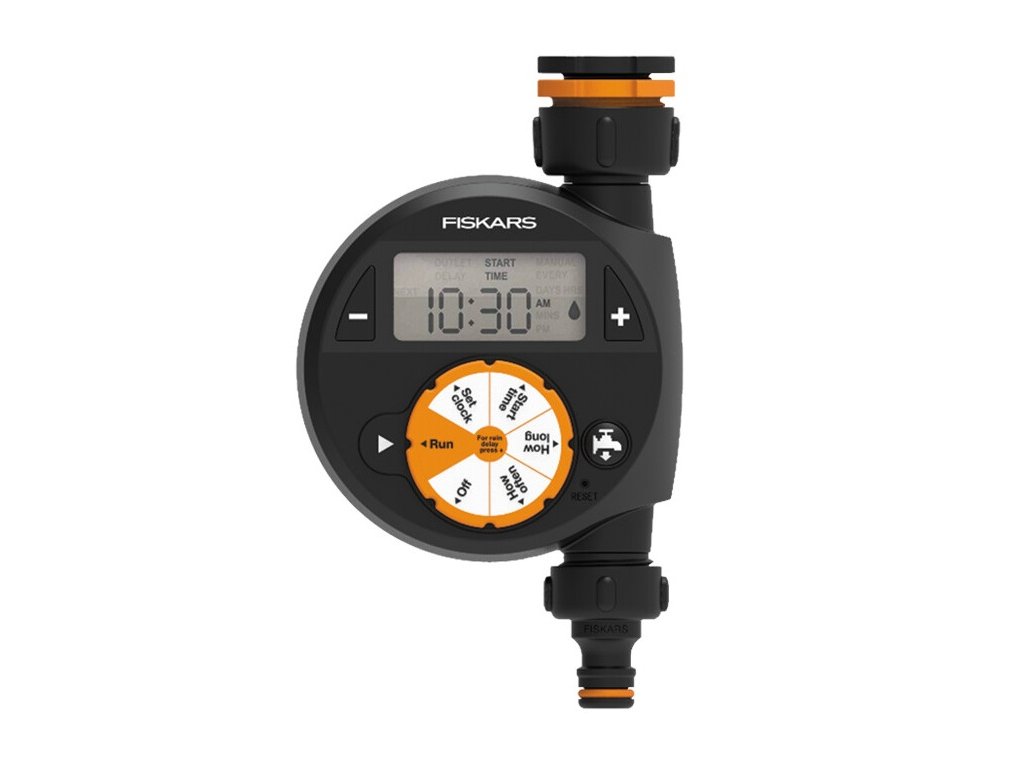 Kvalitný zavlažovací časovač s jedným výstupom FISKARS má jednoducho programovateľný čas zahájenia, dobu trvania, frekvenciu zavlažovania, oneskorenie zavlažovania, vrátane možnosti okamžitého ručného zavlažovania. Pre spojku ku kohútiku sú vhodné 3 veľkosti závitov. Sú to: Ø 21 mm (G 1/2"), Ø 26,5 mm (G 3/4") a Ø 33,3 mm (G 1“). Keď bude batéria nastavovača slabá, zabudovaná ochrana proti vybitiu ihneď zastaví zavlažovanie. Časovač sa nabíja pomocou 2 x AA bateriek (tie však nie sú súčasťou balenia). Pripojenie je univerzálne a kompatibilné s ostatnými značkami.