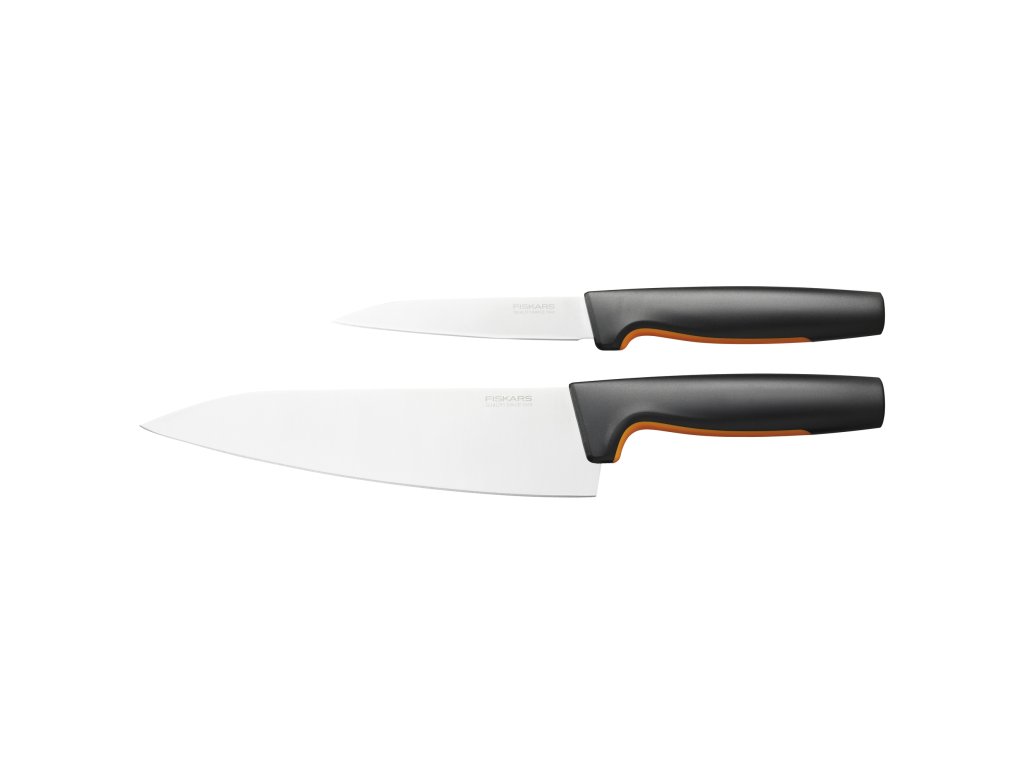 Kuchárska sada nožov Fiskars obsahuje dva kvalitné nože z rady Functional Form. Okrajovací nôž má 11 centimetrov dlhú rovnú čepeľ a ostrý hrot a je ideálny na krájanie ovocia a zeleniny. Vhodný je tiež aj na vyrezávanie škvŕn a kazov na potravinách. Veľký kuchársky nôž má vysokú silnú čepeľ s dĺžkou 20 centimetrov a je ideálny na krájanie mäsa, zeleniny alebo na sekanie bylinek.
