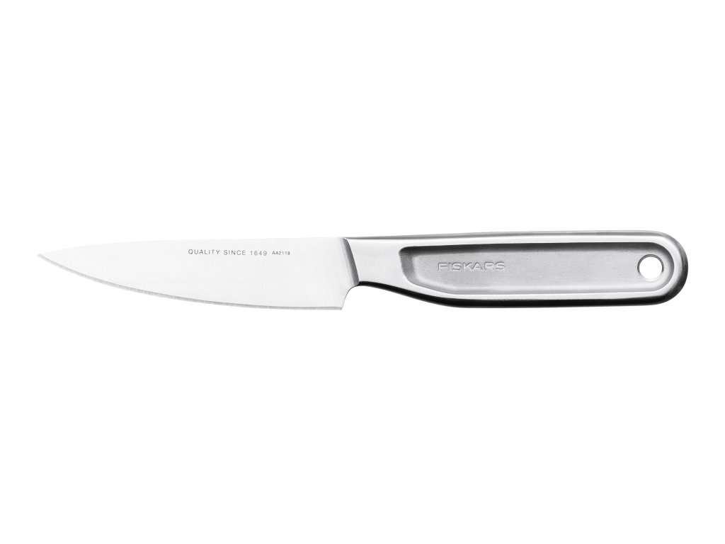 Okrajovací nôž Fiskars All Steel so silnou 10 centimetrovou čepeľou ideálnou na lúpanie a krájanie ovocia a zeleniny. Nôž je vyrobený z vysokokvalitnej prémiovej ocele, ktorá zaručuje prvotriedny výkon s dlhou životnosťou. Japonská oceľ s vysokým obsahom uhlíka má vynikajúcu trvanlivosť a zhotovenie celého noža z jedného kusu, čím ponúka nadčasový dizajn. Vďaka optimálnemu vyváženiu noža je krájanie pohodlné a prirodzené. Odporúča sa ručné umývanie noža.