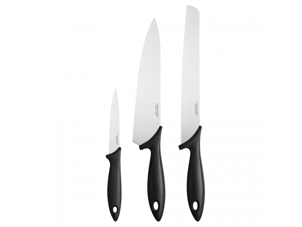 Výhodná základná sada nožov FISKARS rady Essential obsahuje tri typy nožov - nôž na pečivo, kuchynský a okrajovací. Rada Essential ponúka kvalitné nože, ktoré sú vhodné pre každodenné používanie. Majú masívne držadlá so zarážkou pre prsty zaručujúce bezpečný úchop. Vďaka tomu sa aj pohodlne používajú. Nože sa vyznačujú ostrými čepeľami, ktoré sa ľahko udržujú pomocou brúsky alebo ocieľky Fiskars. Čepele nožov Essential sú vyrobené z vysokokvalitnej japonskej nerezovej ocele s tvrdosťou HRC 53. Rukoväte nožov sú vyrobené z čierneho nárazuvzdorného polypropylénu. Všetky nože je možné umývať v umývačke riadu.
