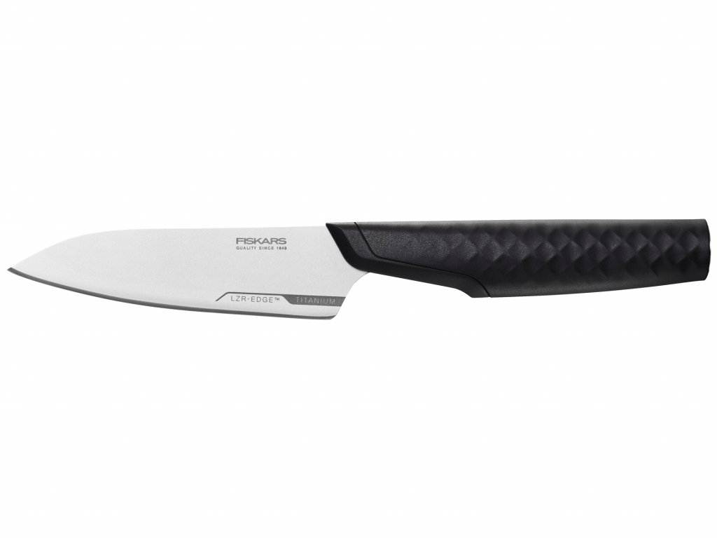 Kvalitný univerzálny okrajovací nôž Fiskars z rady Taiten má 10 centimetrov dlhú čepeľ a je ideálny pre najrôznejšie druhy krájania a lúpania. Tento nôž váži len 51 gramov, vďaka čomu znižuje námahu ruky a umožňuje mimoriadnu presnosť a ľahké používanie. Inovatívna titánová čepeľ je extrémne ľahká a perfektne sa ovláda. Revolučná technológia LZR-EDGETM udržuje ostrie 4x dlhšie ostré v porovnaní so štandardnými nožmi. Ergonomická rukoväť s 3D textúrou sa výborne drží v ruke. K ostreniu nožov Taiten sa odporúča používať keramická brúska.