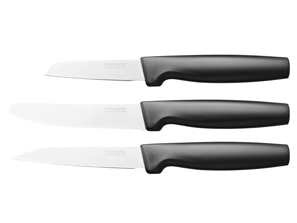 Praktický set malých nožov Fiskars z rady Functional form obsahuje tri nože – okrajovací nôž, raňajkový nôž a nôž na raňajky alebo steaky. Okrajovací nôž sa skvelo hodí na krájanie ovocia a zeleniny, má 11 centimetrov dlhú čepeľ. Dva raňajkové nože s vrúbkovaným ostrým majú čepele dlhé 12 centimetrov a sú ideálne na krájanie čerstvého pečiva alebo menšieho chleba. Výborne sa s nimi krájajú aj potraviny, ktoré majú tenkú šupku, napríklad paradajky alebo broskyne. Špicatý nôž možno využiť aj ako jedálenský steakový nôž.