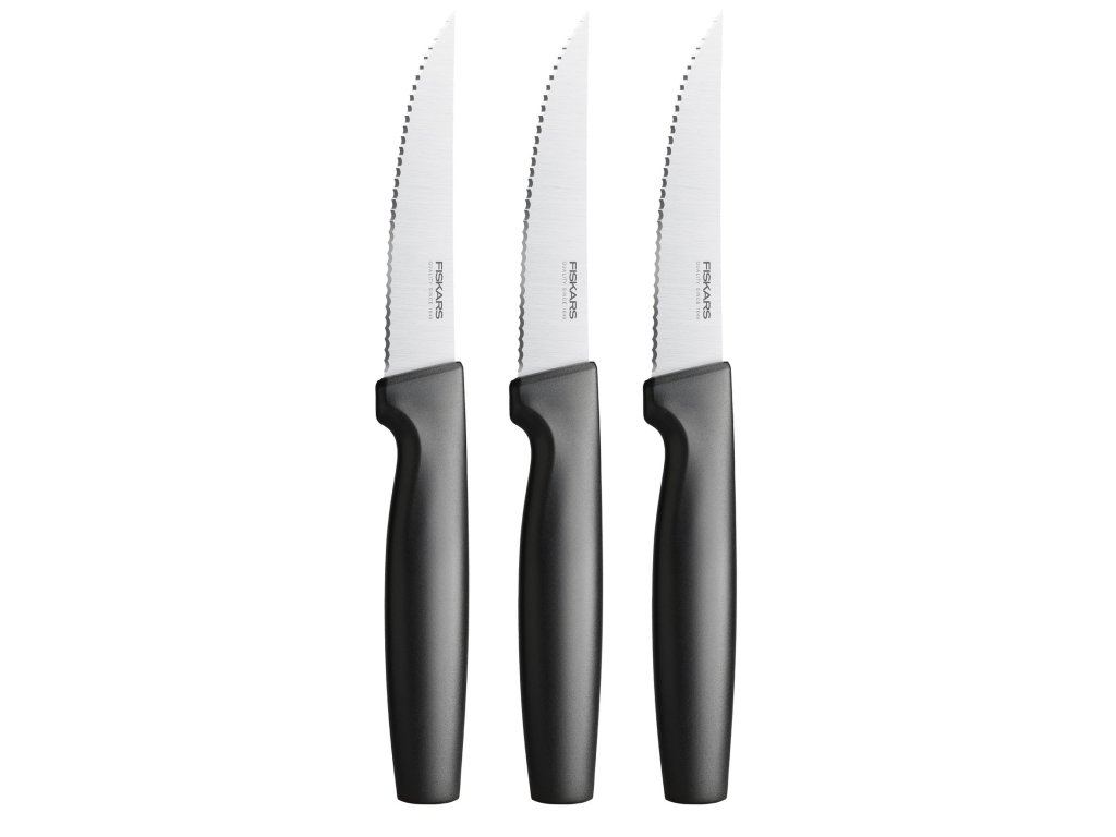 Tento set obsahuje 3 rovnaké steakové nože Fiskars z rady Functional Form. Steakový nôž má vrúbkovanú čepeľ dlhú 12 centimetrov. Svoje využitie nájde aj ako jedálenský nôž na steaky, ale možno s ním krájať aj čerstvé pečivo alebo malý chlieb. Skvelo sa s ním krájajú aj potraviny, ktoré majú tenšiu šupku, obzvlášť rajčiny alebo broskyne.