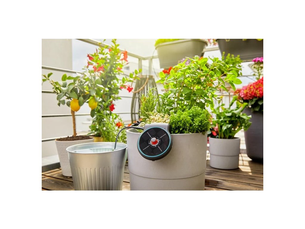Solárne zavlažovanie GARDENA AquaBloom sa postará o vaše balkónové a črepníkové rastliny vtedy, keď nemôžete vy – či už ste na dovolenke, služobnej ceste alebo jednoducho nemáte čas. Ide o kompletný, na použitie pripravený systém, ktorý nepotrebuje vodovodný kohútik ani elektrickú zásuvku – stačí vhodná nádoba na vodu a slnečné miesto pre solárny panel.
