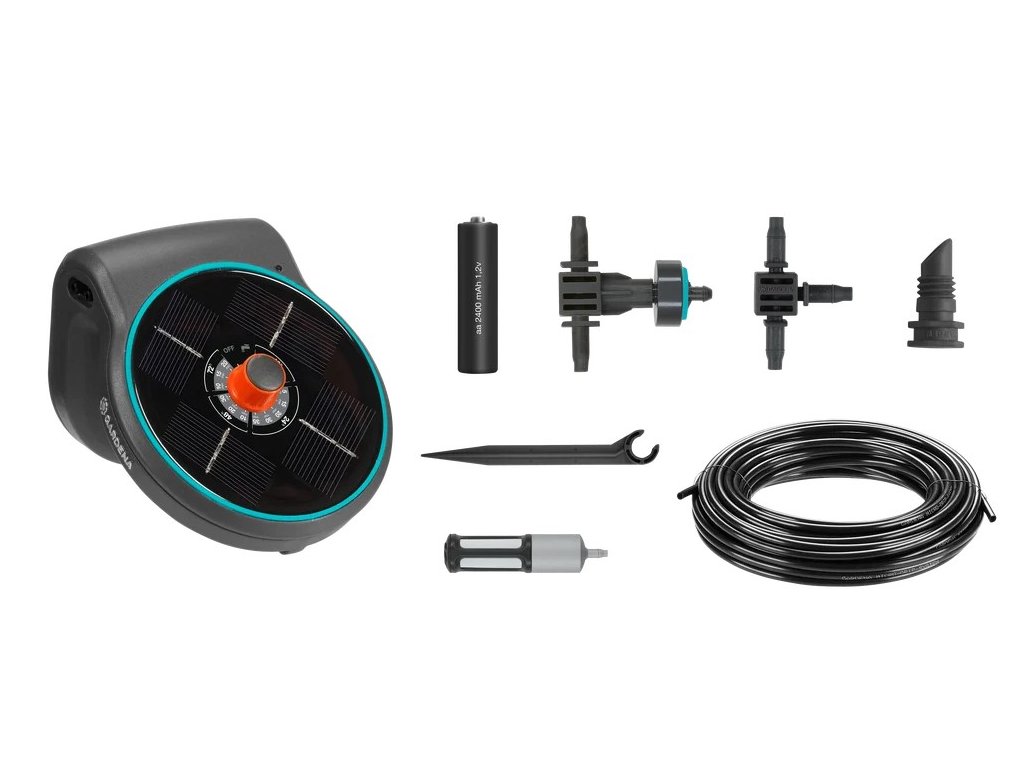| Obsah sady | 1× základný prístroj s integrovaným čerpadlom a solárnym panelom, 20× 0,5 l/h tlak vyrovnávajúci radový kvapkač, 15× (3/16") držiak rúrky, 3× dobíjacia AA batéria 1,2 V / 2 400 mAh, 8× (3/16") zátka, 1× filter, 20 m (3/16") rozvodná rúrka |