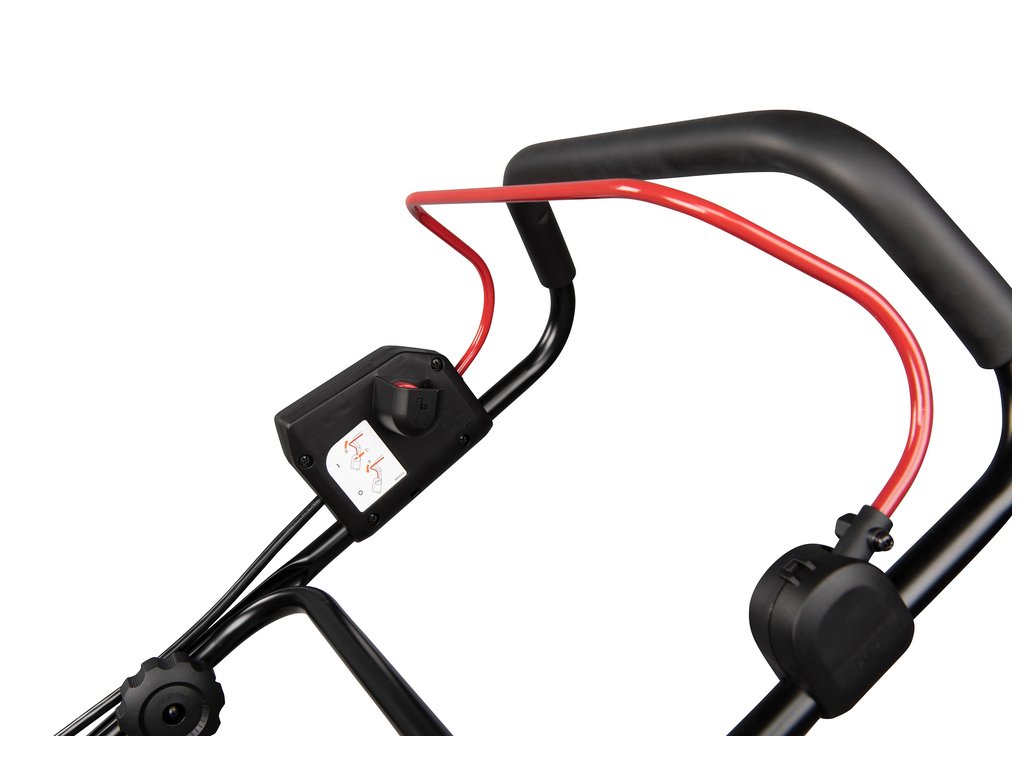 Kosačka umožňuje 13-stupňové centrálne nastavenie výšky kosenia (20–75 mm) a ergonomicky tvarovaná rukoväť s pogumovaným mäkkým úchopom zvyšuje pohodlie pri práci. Plastové teleso znižuje celkovú hmotnosť a uľahčuje manipuláciu.