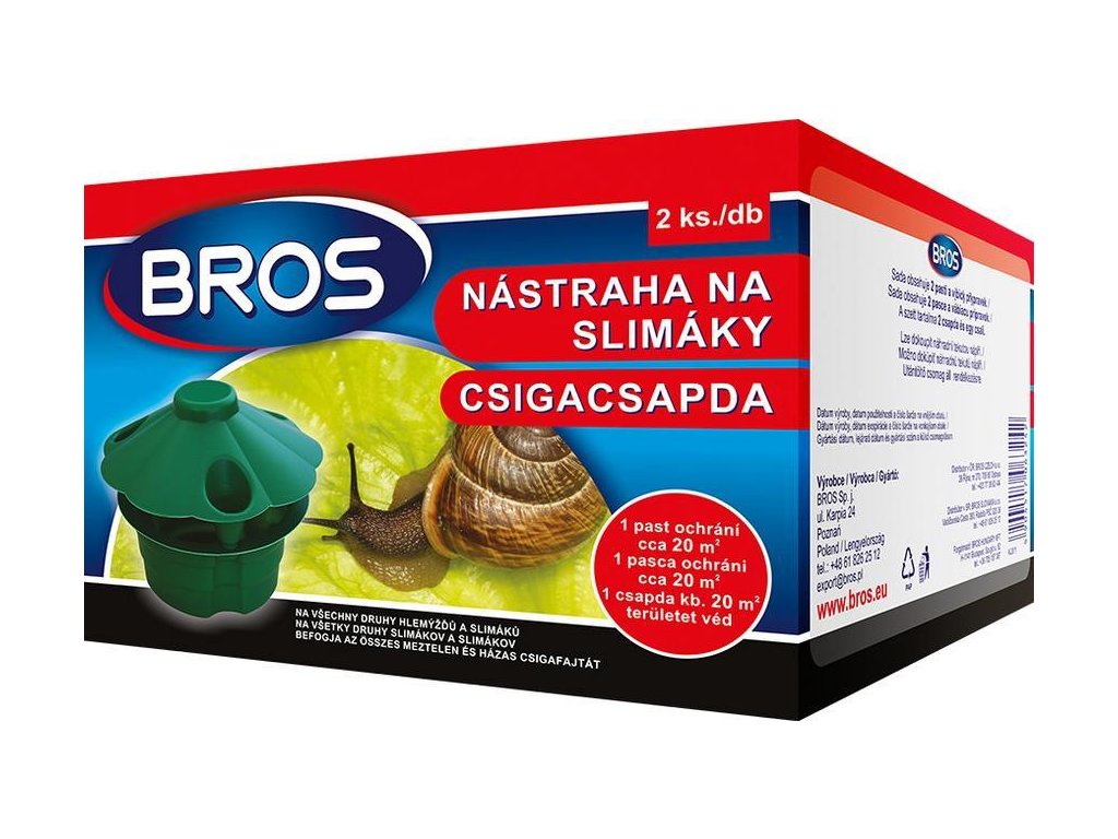 - Pasca Bros na slimáky je určená na sledovanie a chytanie všetkých druhov slimákov. - Vo vnútri zariadenia je kvapalina s obsahom atraktanu, ktorá účinne láka slimáky, ktoré poškodzujú rastliny a zeleninu. - Jedna pasca chráni oblasť s veľkosťou až 20 m2 po celú sezónu.Dodatočné parametre