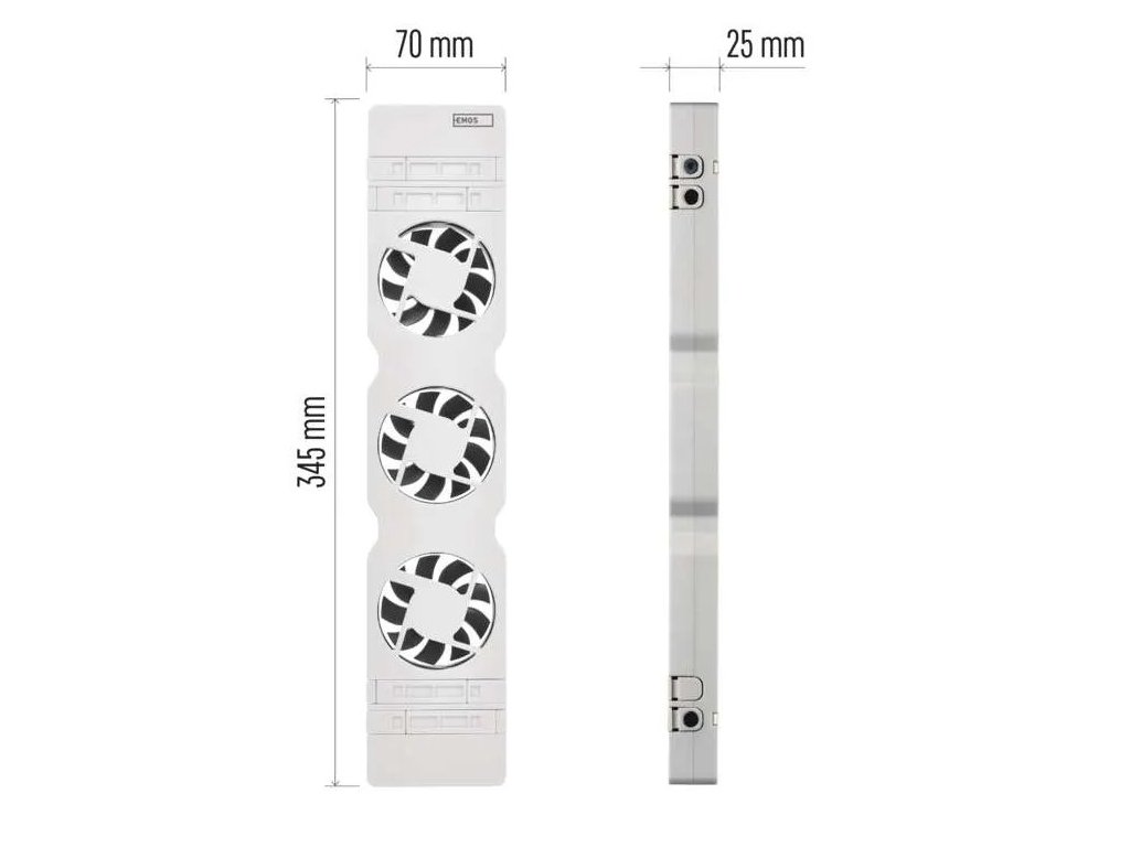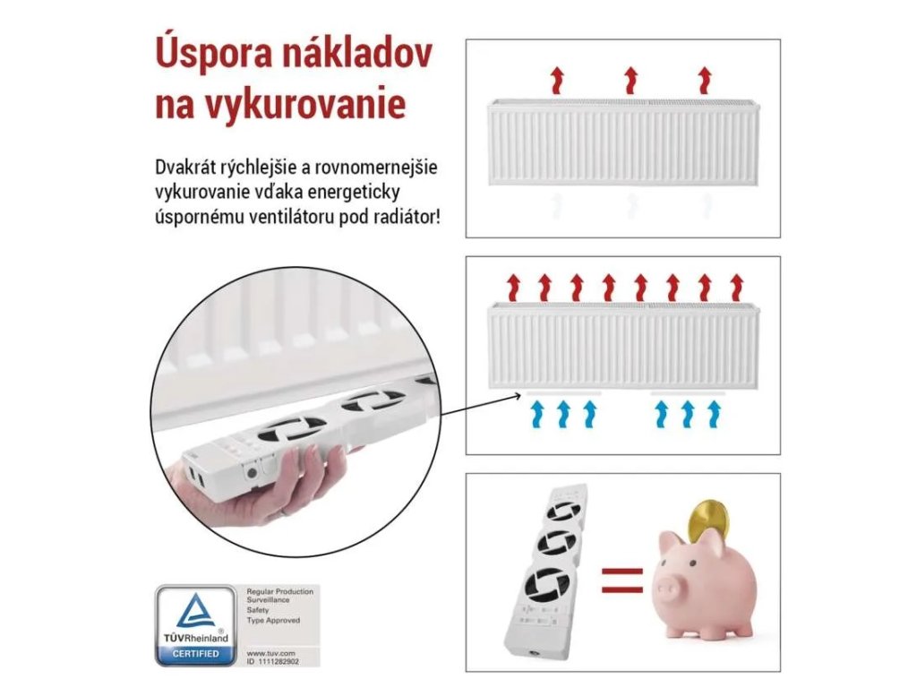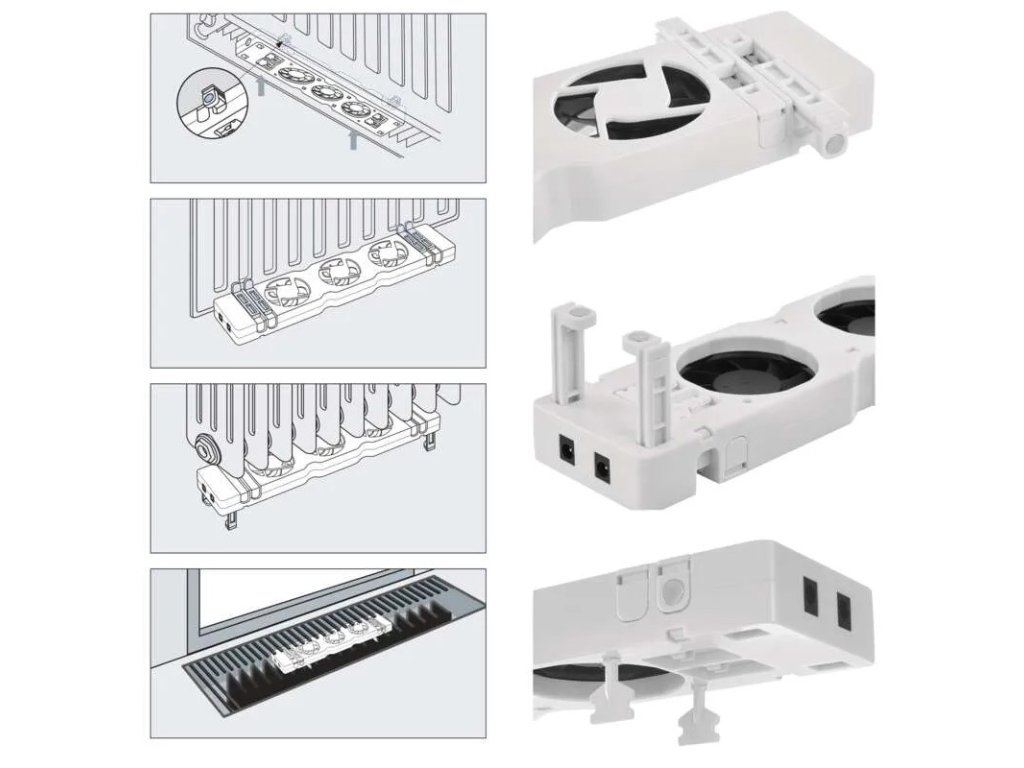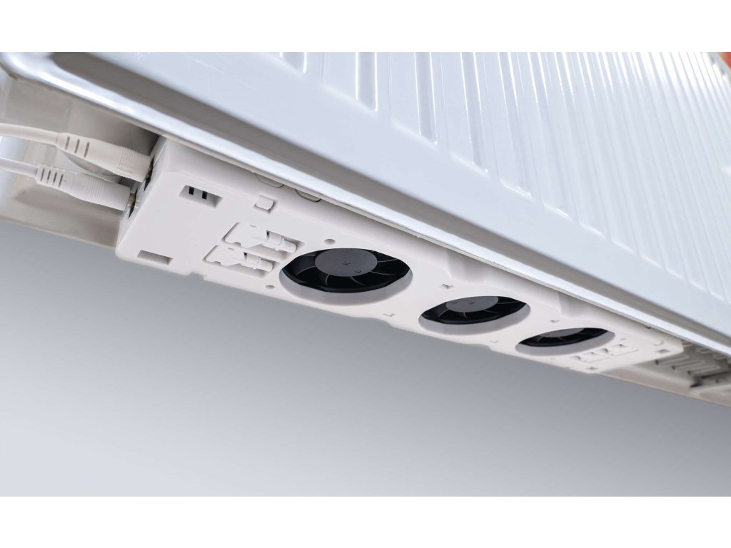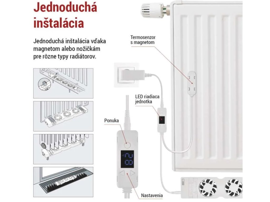 - Jednoduchá inštalácia a flexibilné umiestnenie – ventilátor je možné rýchlo a jednoducho nainštalovať na väčšinu vykurovacích telies bez zložitého náradia alebo odbornej pomoci